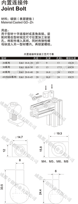 用于型材十字連接時或直角連接,裝配時需在型材規定尺寸位置加工安裝孔,將配件埋入其間,同時將彈性螺母塊放入另一型材槽內,再鎖緊螺栓。